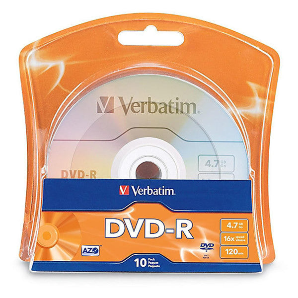 It"s time to ensure your home movies and video clips will stay protected by using the Verbatim 4.7GB 16x Branded Recordable DVD-R Disc (10 Pack). These discs offer 4.7GB, or 120 minutes, of write-once storage capacity, making it great for recording up to 2 hours of DVD quality home movies and video clips. The discs offer Advanced Azo recording dye, which provides the highest level of read/write performance, reliability, and archival life, and are compatible with 1X to 16X DVD-R writers. The DVD-R media is compatible with Pioneer, Apple, Sony, Panasonic and other leading drive manufacturers.