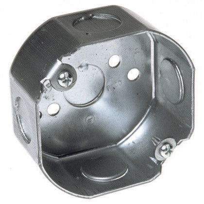 3-1/4" Octagon Box, Drawn, Metallic. Depth: 1-1/2". Side Knockouts: (4) 1/2". Bottom Knockouts: (1) 1/2" . Cubic Inches: 15.5".Appleton™ and O-Z/Gedney™ metallic 3-1/4" octagon boxes and extension rings are widely recognized for quality, selection and ease of installation. They may be used as a junction box or a device box...