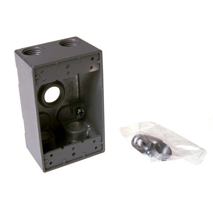 Weatherproof Box, 1-Gang, Die Cast. Depth: 2". (5) 3/4" Threaded Outlets (2 in each end, 1 in back), Cubic Inches: 16.0". Includes: (2) Closure Plugs & Ground Screw. Gray.