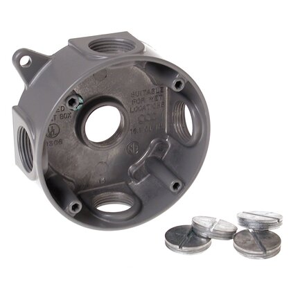 4" Round Weatherproof Box, Die Cast. Depth: 1-1/2". (5) 3/4" Threaded Outlets (4 in sides, 1 in back), Includes: (4) Closure Plugs & Ground Screw. Color: Gray