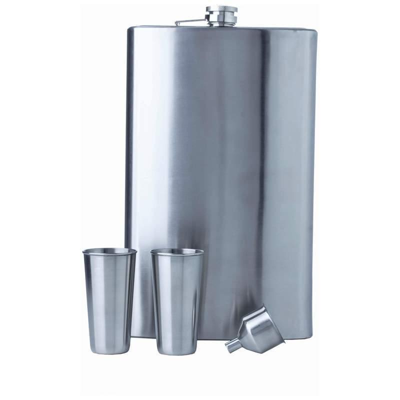Go big or go home! Go anywhere you like with the Maxam 4pc "Giant Shot" Stainless Steel Flask Set. An impressive 64oz flask and whopping pair of 3oz shot glasses create an instant party anywhere you take it. Bonus large funnel included. The flask features a screw-down cap, brushed finish...
