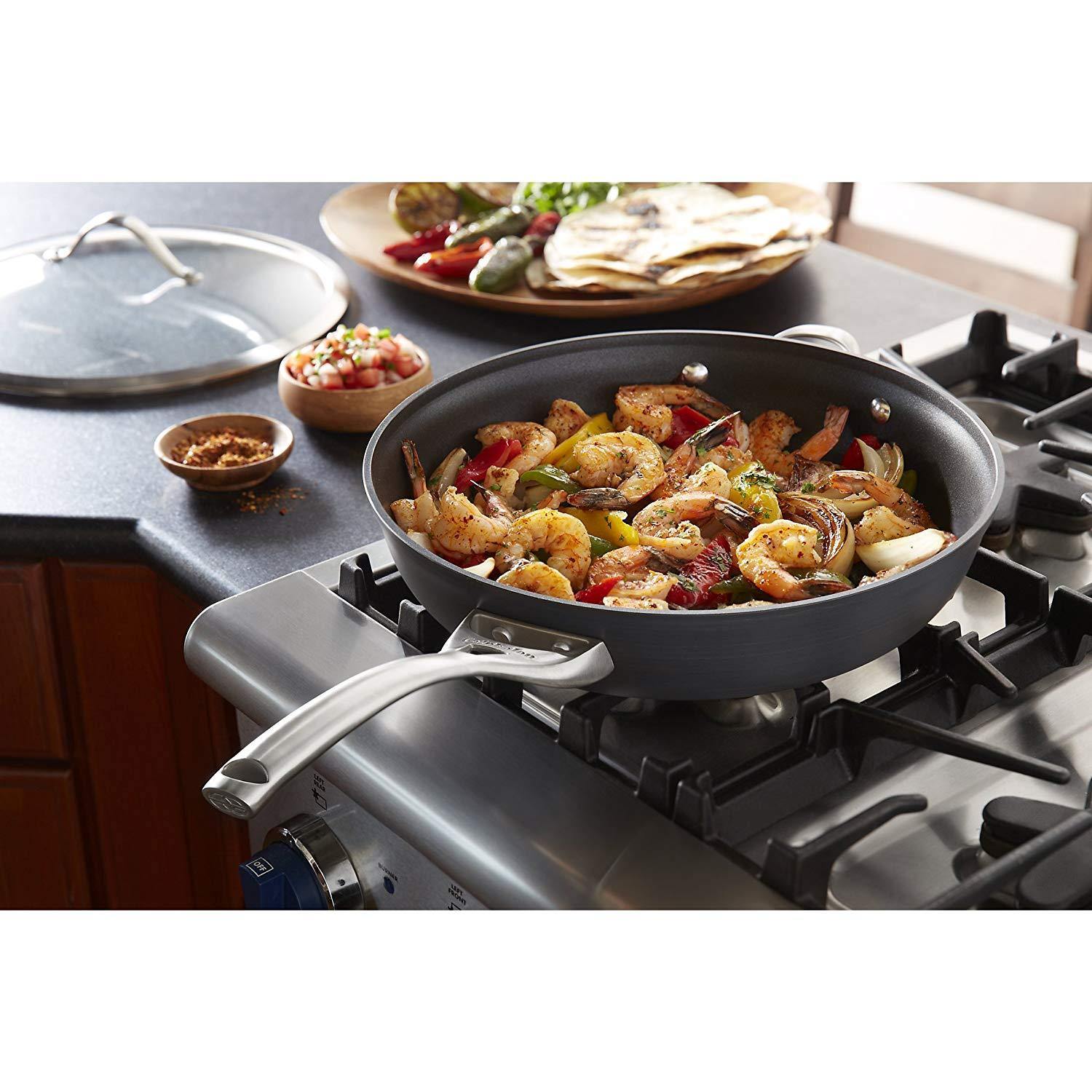 Heavy-gauge aluminum construction ensures even heating and is hard-anodized for durability. It also makes it dishwasher-safe Interior includes three layers of nonstick coating - two layers provide durability and the third layer offers easy release performance.Utensils: Nylon, Coated or Wood The long, brushed stainless steel handles are designed to stay...