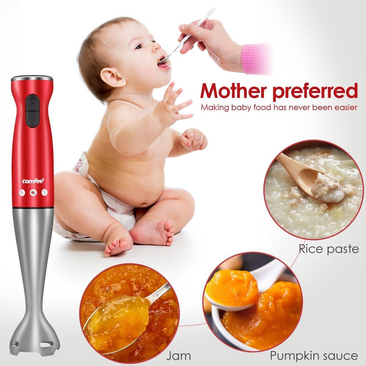 Electric Hand Immersion Blender, 4-in-1 Hand Mixer with 500ml Food Chopper, 600ml Beaker, Balloon Whisk, Stainless Steel Blending Shaft by Comfee (Red)