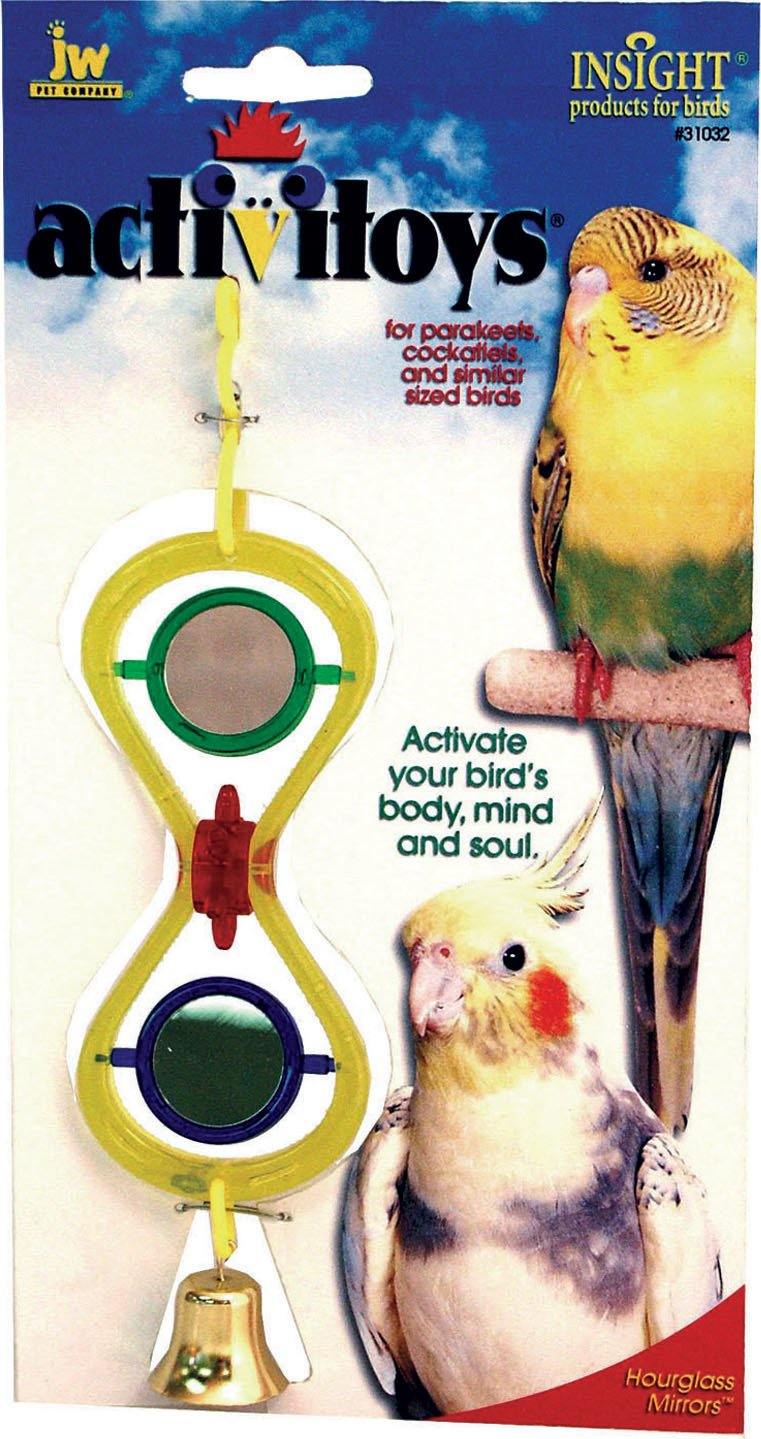Neon colored hour glass toy has a moving toggle wheel spinning mirrors and a bell to ring. Provides exercise and stimulation for your bird's health and well-being. Ideal for parakeets cockatiels and similar sized birds.