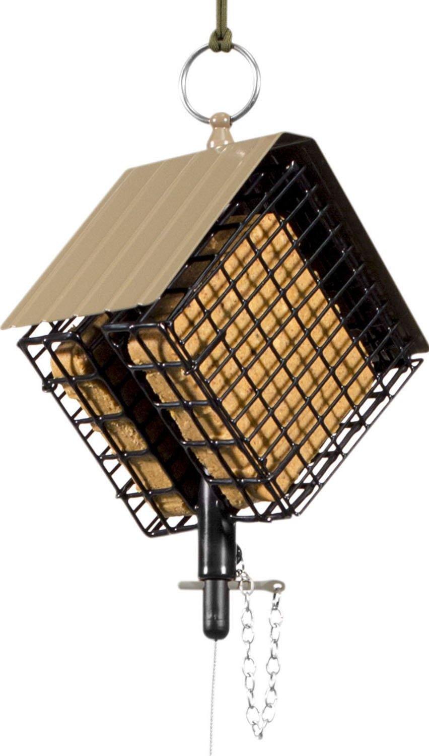 Pitched roof design helps protect suet against rain Double sided design holds two cakes for longer lasting feeding Perfectly designed for attracting woodpeckers nuthatches and other protein eating birds Feeder slides up and down to eliminate reaching and bending Powder coated steel roof with metal cage