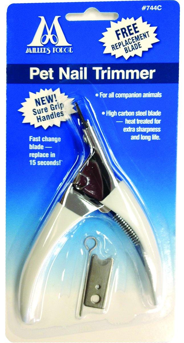 Pet nail trimmer includes free replacement blade and styptic powder. High carbon steel blade is heat treated for extra sharpness and long life. Fast change blade replaces in seconds. Gently and quickly trims pet's nails.