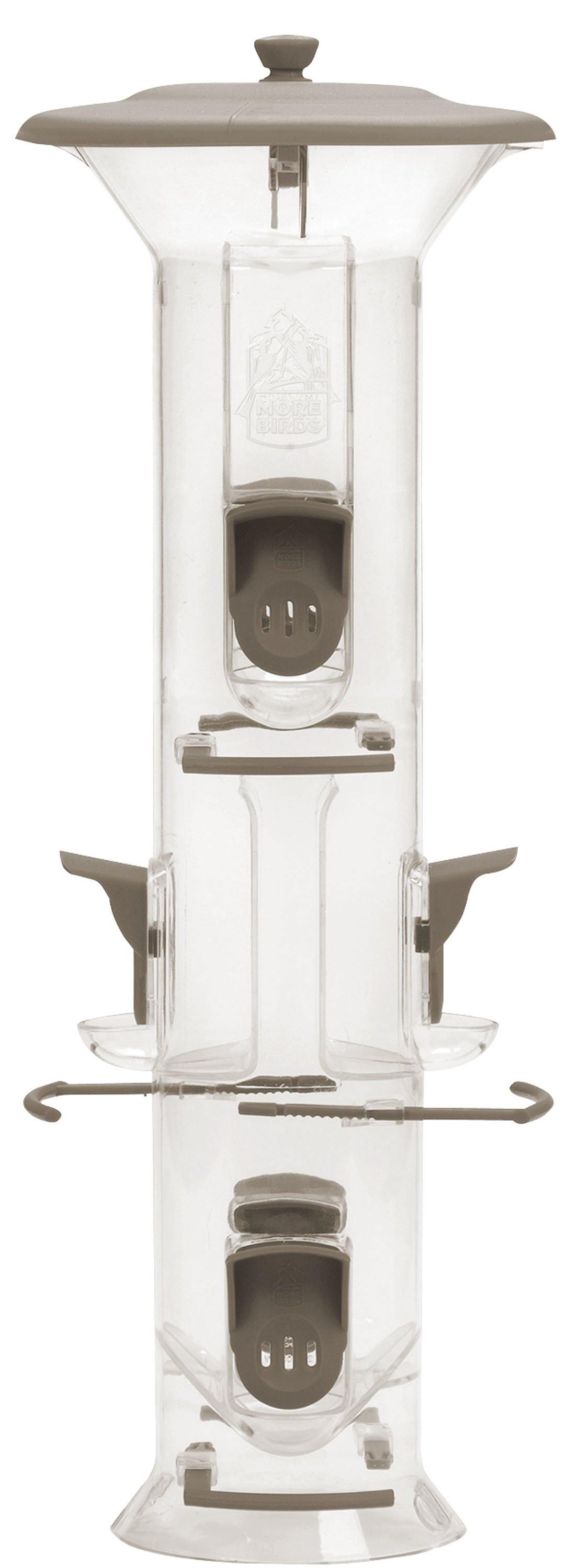 Slide shutter down to dispense nyjer seed for finches. Wide-mouth hopper design offers easy-fill - reduces or eliminates spillage. Six feeding stations each with unique anyseed port to accommodate thistle mixed seed or sunflower seed. Allocates seed evenly to all six ports - no more barren ports to keep birds...
