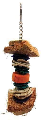 A vertical delight of java wood folded banana leaves and coconut husks. Sturdy steel hardware allows you to hang the toy anywhere in the cage for easy access and lots of foraging fun Great for smaller birds Size: [6x2 In]