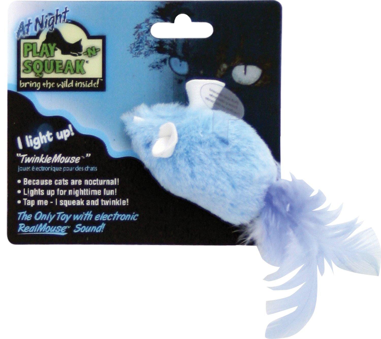 Tap twinkle mouse it squeaks and twinkles. Lights up for nighttime fun.