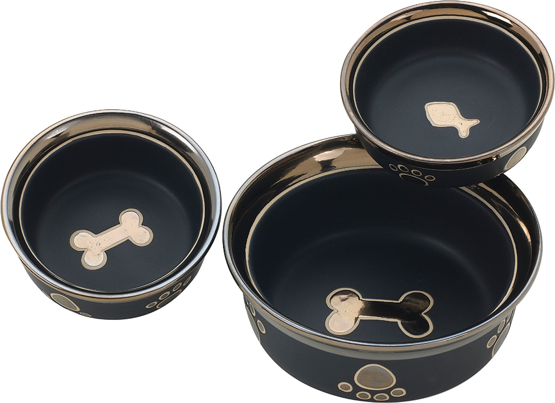 Stylish stoneware dish has a metallic rim and accents. Matte black finish. Size: [7 Inch]