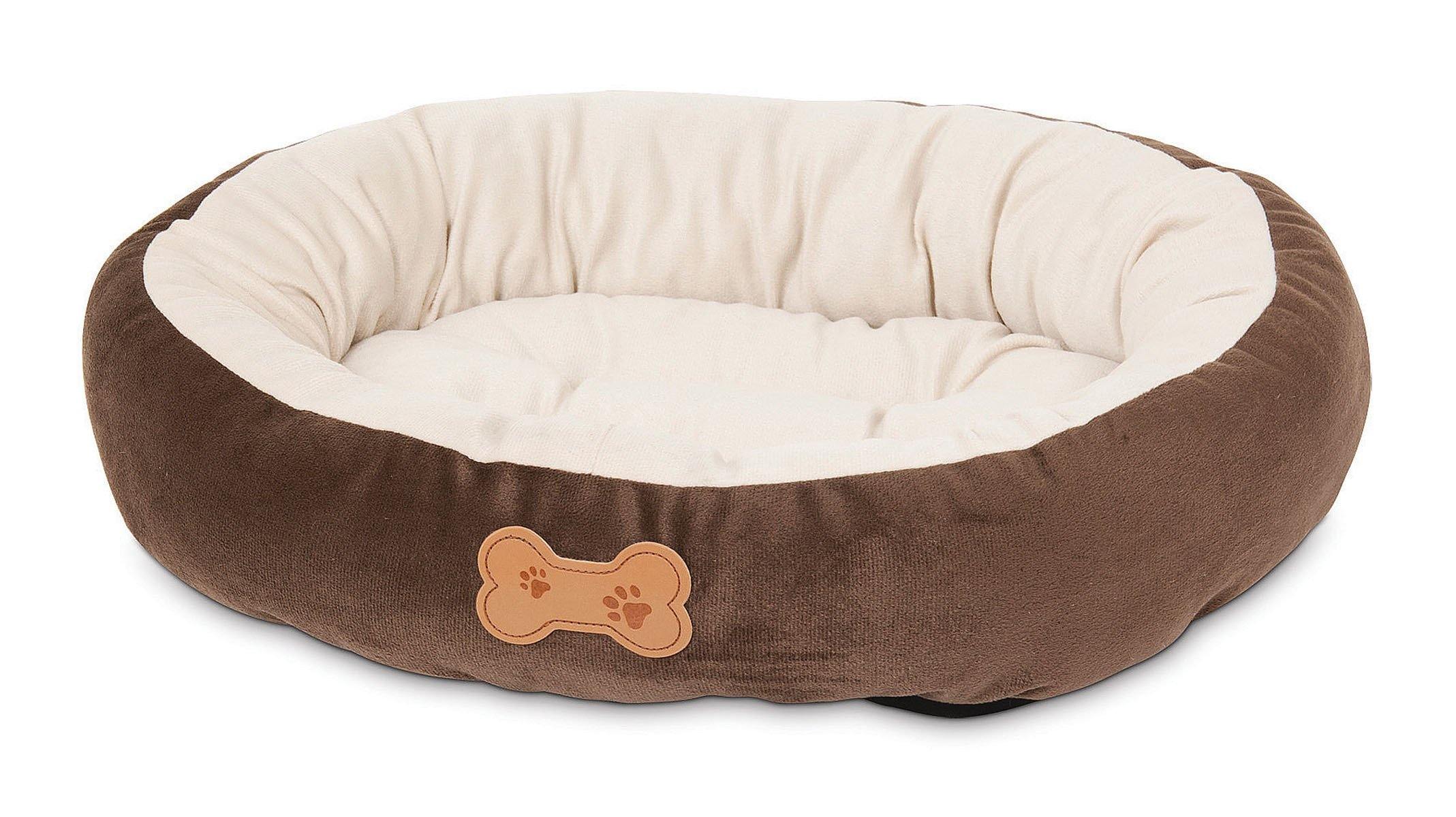 Raised sides help promote the nesting instinct and reduce exposure to drafts. Features a decorative bone applique. Filled with high-loft recycled polyester fiber fill that will make pets feel like they are on cloud nine. Machine washable for easy care. Features solid fabric with contrasting plush sleep area. Size: [20...