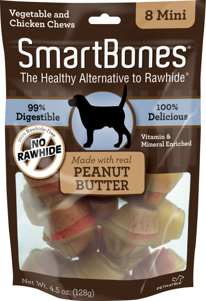 100 percent rawhide free. Made with real dried chicken breast and real peanut butter. Fortified with vitamins and minerals. 99 percent digestible. 100 percent delicious. Mini/ Size: [8] pack