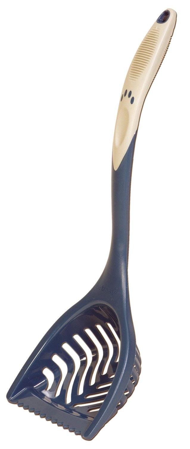 Extra-long handle. Comfortable rubber grip. The high back design adds sifting capacity and rounded corners will get into the hard to reach places.