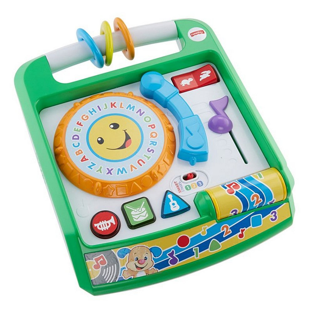 DJ Baby is in the house! The Fisher-Price Laugh & Learn Remix Record Player lets babies put their own spin on learning play with three levels of learning content built-in activities and fun music so they can rock out while learning about opposites colors numbers shapes and more! This rockin' toy provides several ways for little DJs to play and learn. When babies spin the record or bat at the roller bar they'll hear a variety of cool tunes and phrases. (Let's play some tunes!) Colorful buttons help babies learn about shapes and colors. And as little ones grow they'll even start to learn simple words in Spanish (Blue! Azul!)! They can also slide the volume switch up and down or flip the toggle switch to hear music and phrases to learn about opposites. This is a lean mean spin and learn machine! It even gives fine motor skills a boost when babies grasp and interact with the clacker beads buttons and toggles spin the record slide the record arm and more. As little ones grow so does the way they play and learn.