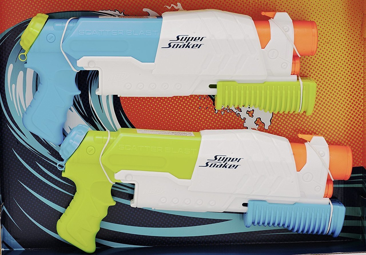 2 Pack of Nerf ScatterBlast Super Soakers Blasters come in blue and green Holds 650 mL of water and can blast up to 10 metres Super wide 5 stream soak range